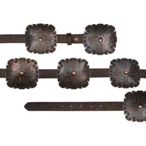 From Angel Ranch this leather belt features a floral embossed strap, large square antique copper Conchos with a removable antique copper tone buckle.