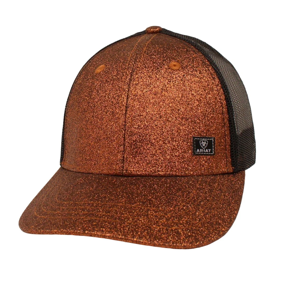 You will love to wear this fashionable and comfortable Ariat cap by M&F Western Products every time you go out. There is a small Ariat logo tag on the front of this copper glitter cap. There is an opening in the back for your ponytail, and a mesh back with snap adjustments so you will get a perfect fit. You will get plenty of compliments on this great cap.
