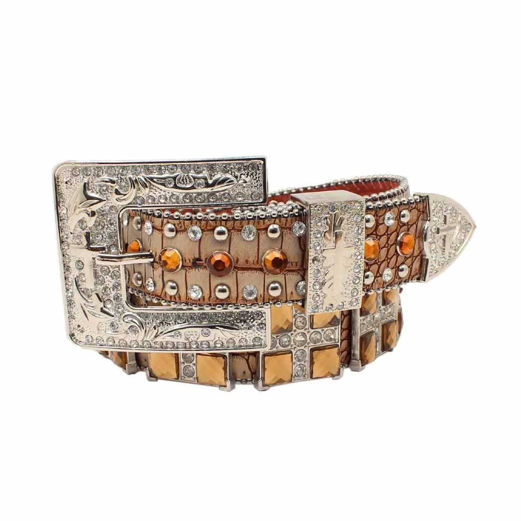 This great Blazin Roxx belt by M&F Western Products starts with a brown croc print strap. This belt features large square crystals and rhinestones for tons of bling. It also has ball chain edging and removable silver buckle that complete this unique and stylish belt.