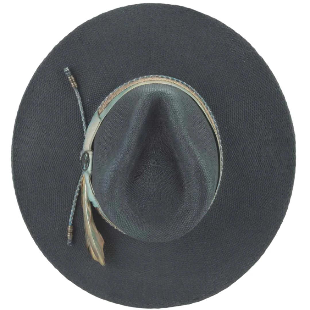 The Selfish Love is a straw hat by Bullhide. The Selfish Love is part of Bullhides Western Couture Straw Collection. It is a black pinch front straw with a contrasting ribbon, a leather cord & feathers.