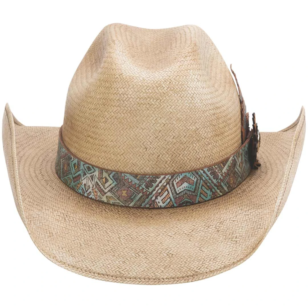 The South West Love is a straw hat by Bullhide. The South West Love is part of Bullhides Western Couture Straw Collection. It is a pecan rodeo straw with a Southwestern print hat band with leather feather and concho accent.