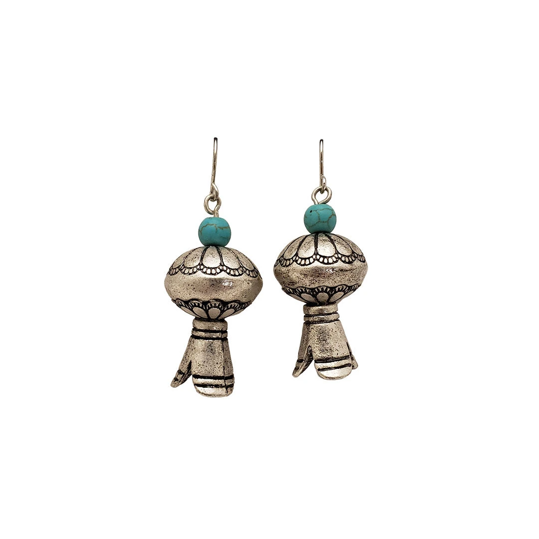 From Cindy Smith, these beautiful squashend earrings feature a light patina finish for that vintage look with a turquoise bead attached to a hook.