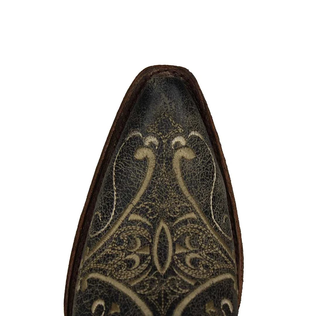 From Circle G by Corral, these black crackle western boots feature tan filigree embroidery. Wear with jeans or a dress for a lovely look, perfect for any occasion.