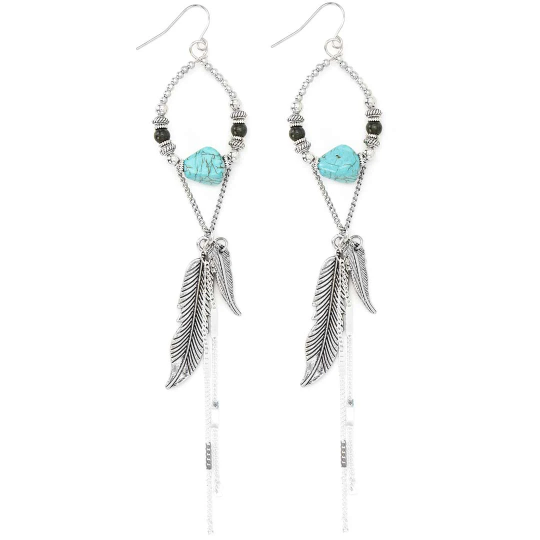 These Cowgirl Confetti silver chandelier earrings feature tiny silver beads and turquoise nugget hoops dripping with intricate feathers and shimmery chain.