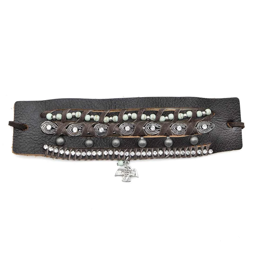 This Cowgirl Confetti dark brown multi-strap leather cuff has an adjustable tie closure. Each hand crafted strap is unique with rhinestones, turquoise beads, silver studs, and suede wrapped antiqued beads. The dangling firebird charm and turquoise bead is a beautiful finishing touch.