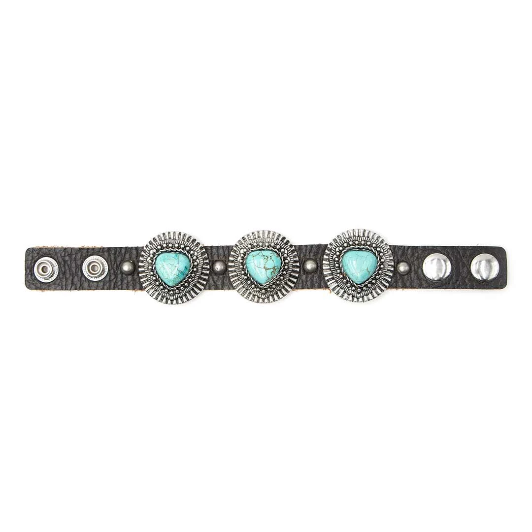This Cowgirl Confetti Dark brown triple strap studded leather cuff has an adjustable snap closure. Turquoise hearts are set in beautiful layered medallions.