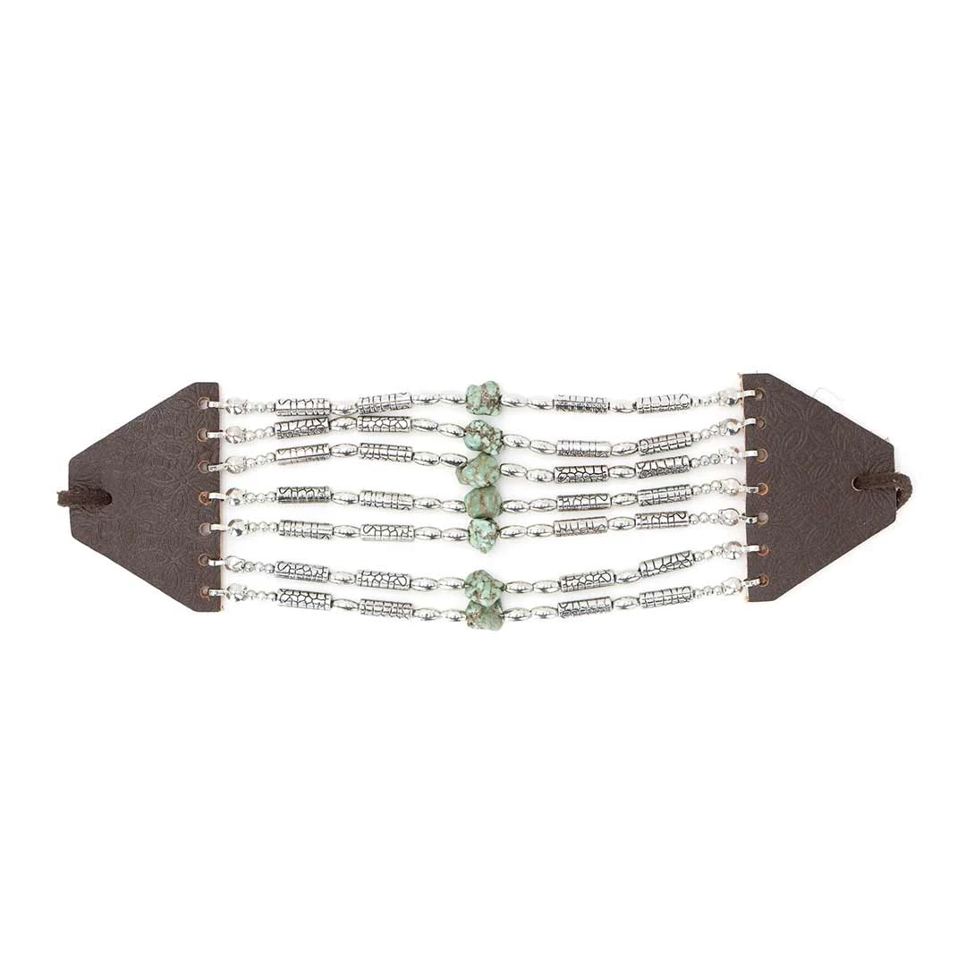 This Cowgirl Confetti Multilayered silver etched tube beads and green turquoise cuff has an adjustable tie closure and brown embossed leather ends.