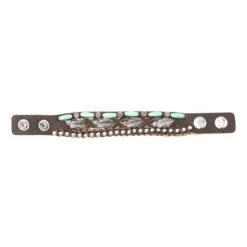 This Cowgirl Confetti chocolate brown embossed leather cuff has an adjustable tie closure. It features triple scalloped oval medallions with beautiful rhinestones.