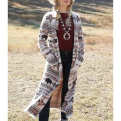 Roam the ranch or walk the streets of downtown wearing a head-turning eyelash sweater knit duster by Cruel Denim. This long cream sweater crafted in acrylic polyester material is decidedly cowgirl with its Southwest bison print plus concho and leather detail. Make your own fashion.