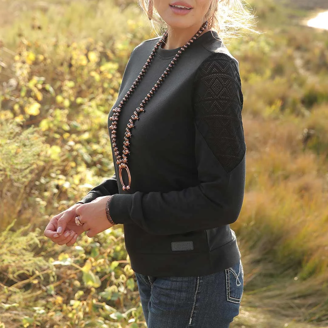 Feel equally at home at the ranch or on a trip into town wearing a black brushed back French terry sweatshirt crafted by Cruel Denim. More than your average sweatshirt, this trendy layer features flexible poly/rayon/spandex construction with lace sleeve piecing and a faux leather logo patch.