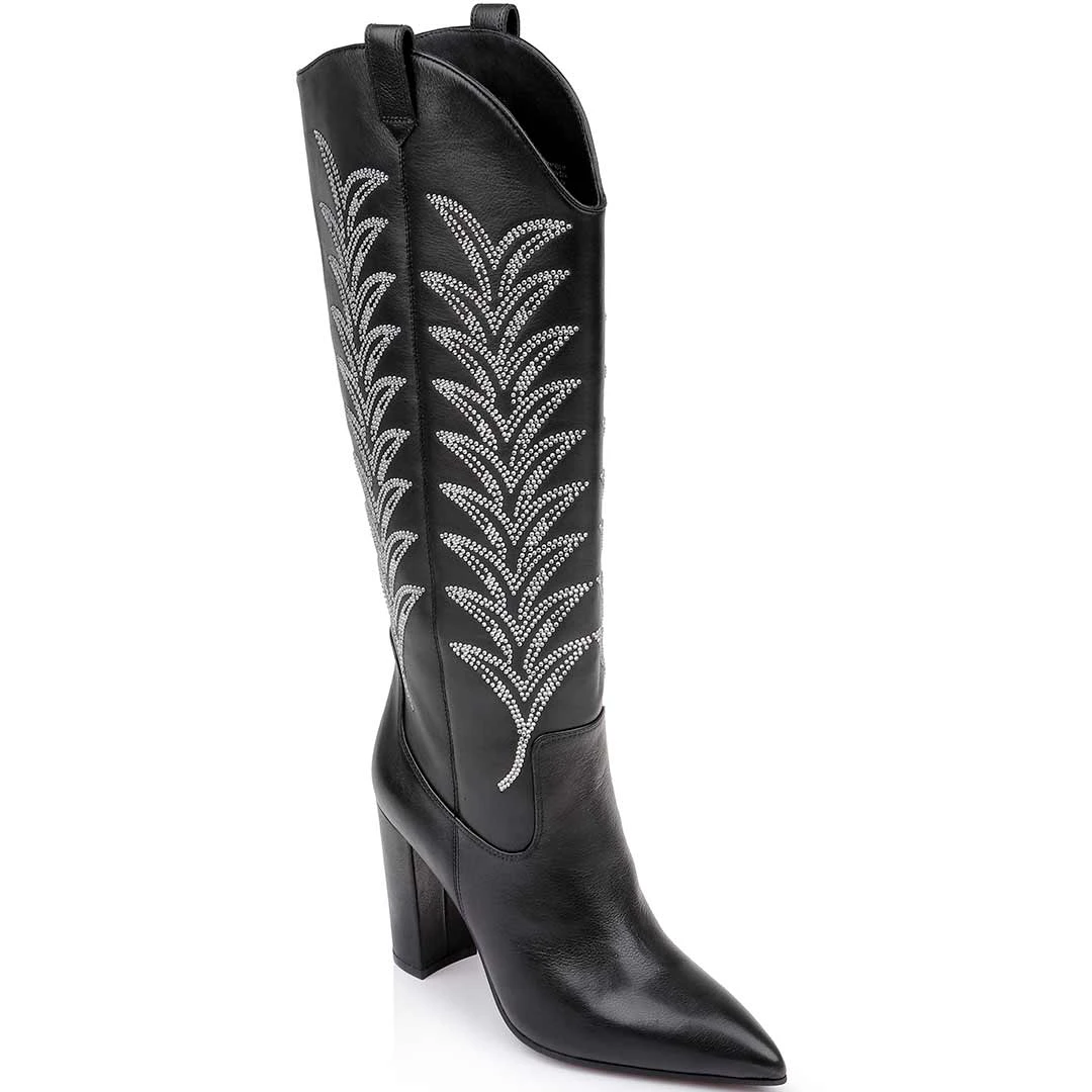 The Tall T Boot features a premium crystal motif atop a soft Italian leather. She comes engineered with a gripped outer sole and extra interior padding for added comfort. City girls wear her with a structured trench coat by day and a fitted leather dress at night. Country girls love her with a cropped white tee in the sun and a jewel tone maxi dress when that sun goes down.