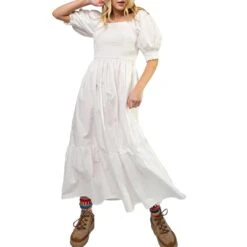 This fun and flirty summer dress from Easel features 3/4 length puff sleeves with elastic cuffs, a smocked bodice, square neck and a two-tiered ruffle skirt.