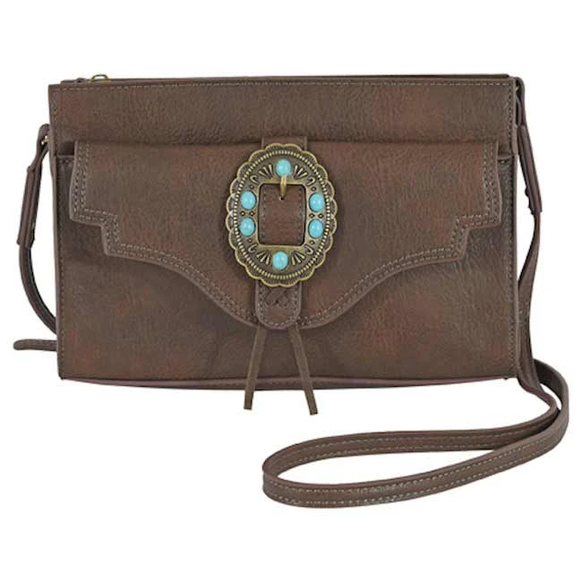 From Justin, this shoulder bag is done in textured brown leather and features an antique brass concho accented with turquoise coloured stones. It has one compartment, one zipper pocket, two organizer pockets, a zipper top closure, one front pocket with snap closure and a zipper pocket at the back.