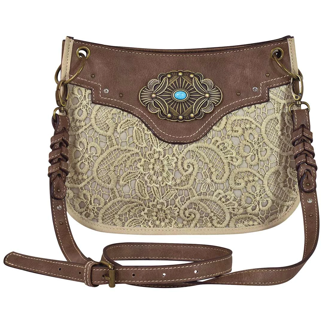 From Justin, this crossbody purse is brown and features an ivory lace overlay and antique brass concho with a faux turquoise accent. It has one interior compartment, two organizational pockets, one zip pocket, one back zip pocket, an adjustable shoulder strap and a magnetic top closure.