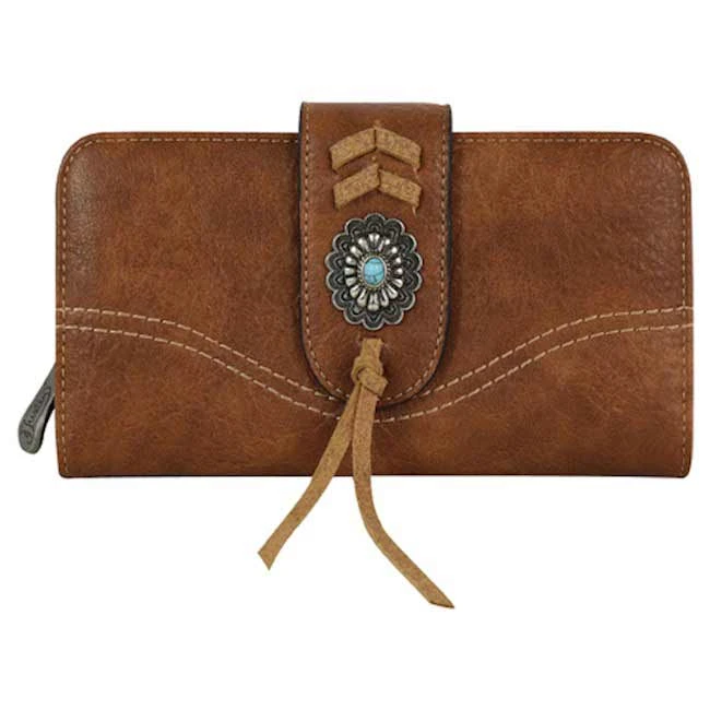 This Justin women’s wallet is brown with a laced trim and features one zipper pocket, two slip pockets, eight credit card slots and a magnetic tab closure.