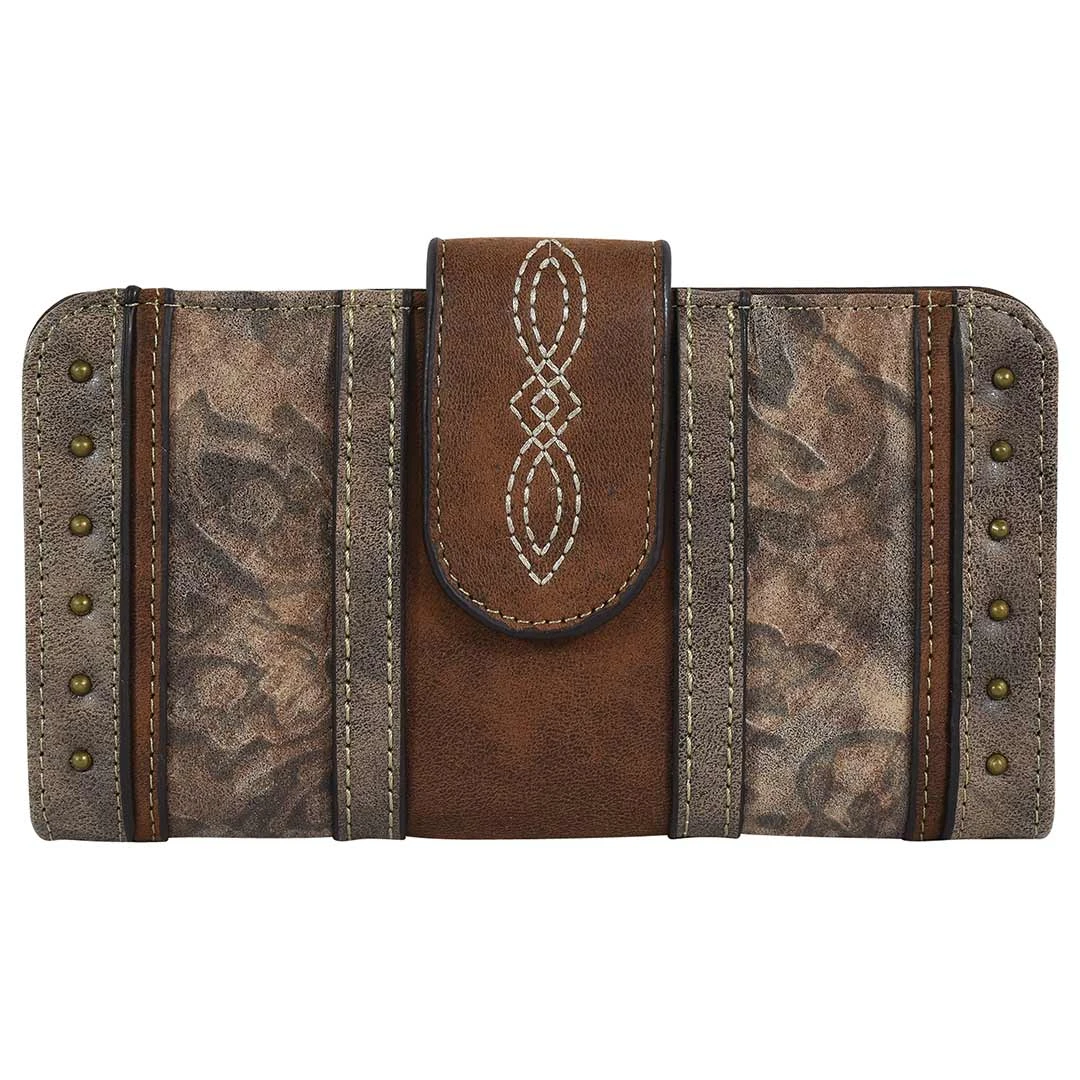 From Justin, this women’s wallet features weathered tooling, brown trim, antique brass studs and boot stitch details. It has one ID window, 2 slip pockets,8 card slots and one zip cash pocket.
