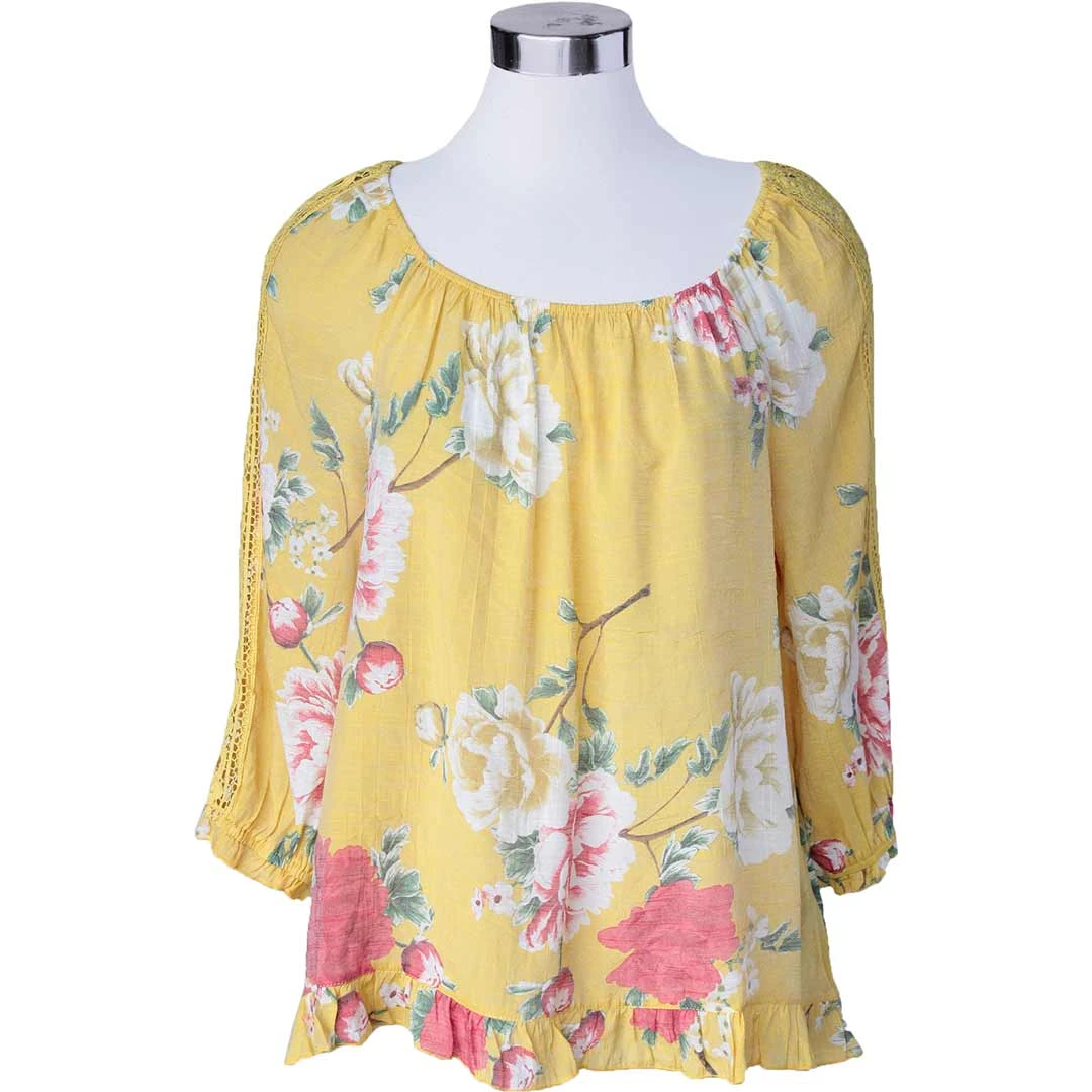 Whether you’re in the office, out with the girls or it’s date night, this women’s blouse is a great choice. Done in a large floral print, it has a wide neck, crochet accent sleeves and ruffle hems.