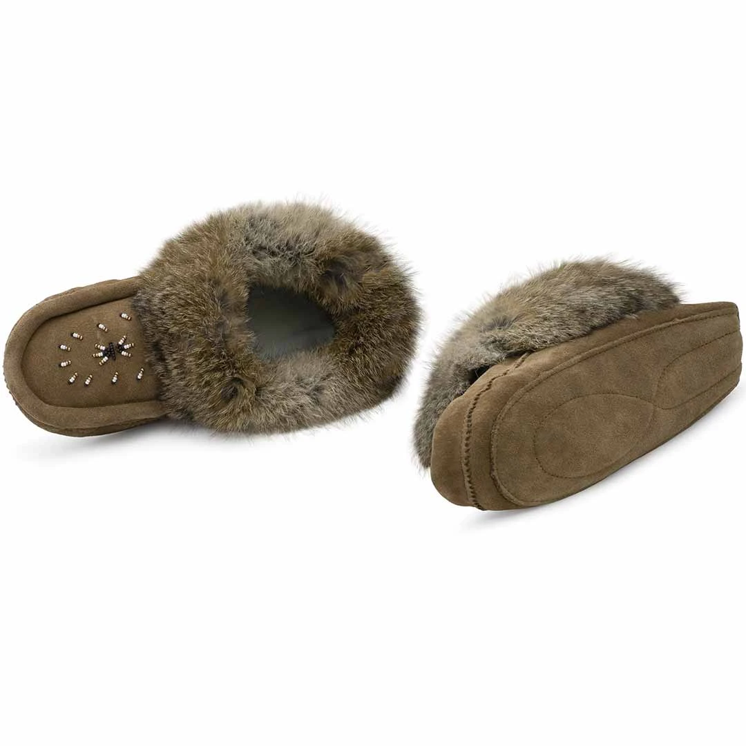 These women’s fur trimmed moccasins will keep your feet cozy and warm. The moccasins feature rabbit fur trim, beaded design, and padded soles.