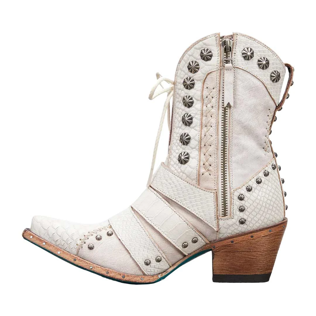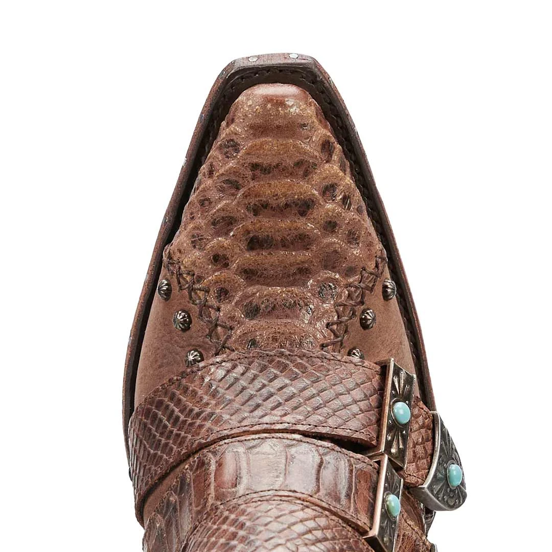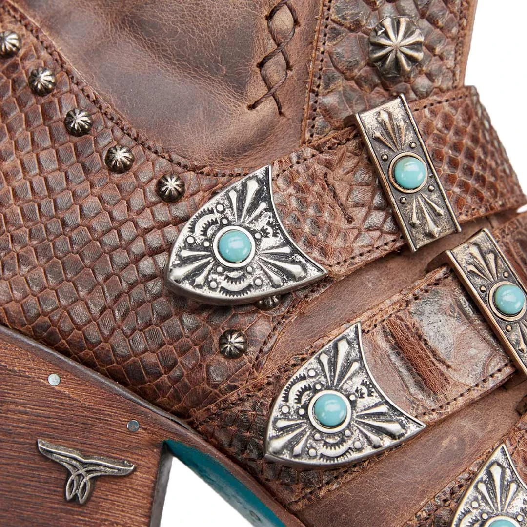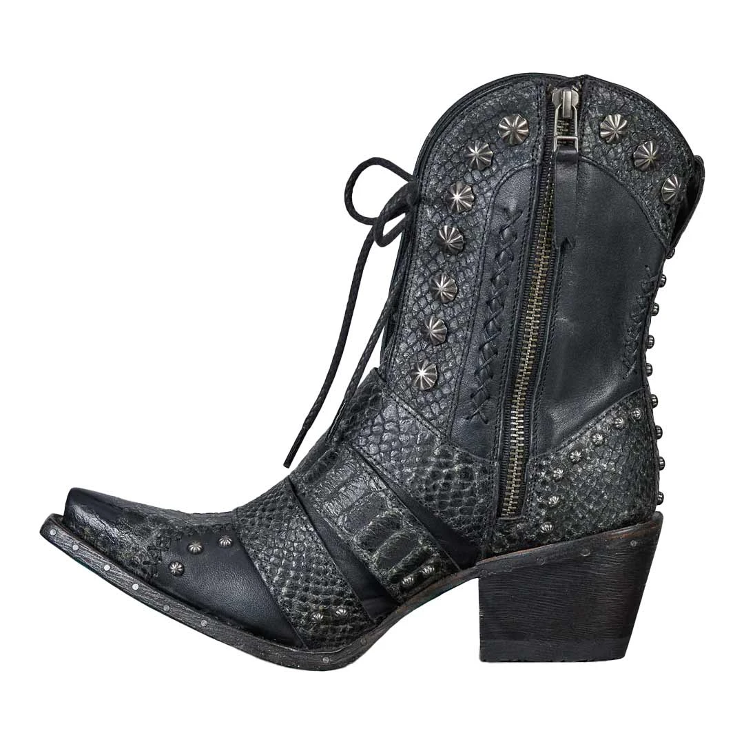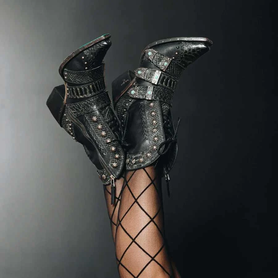 Step out boldly in variegated exotic leather, old pawn inspired hardware, and a functional corset on this ankle boot baddie. An elevated heel to accentuate your best features and bring confidence to your step.