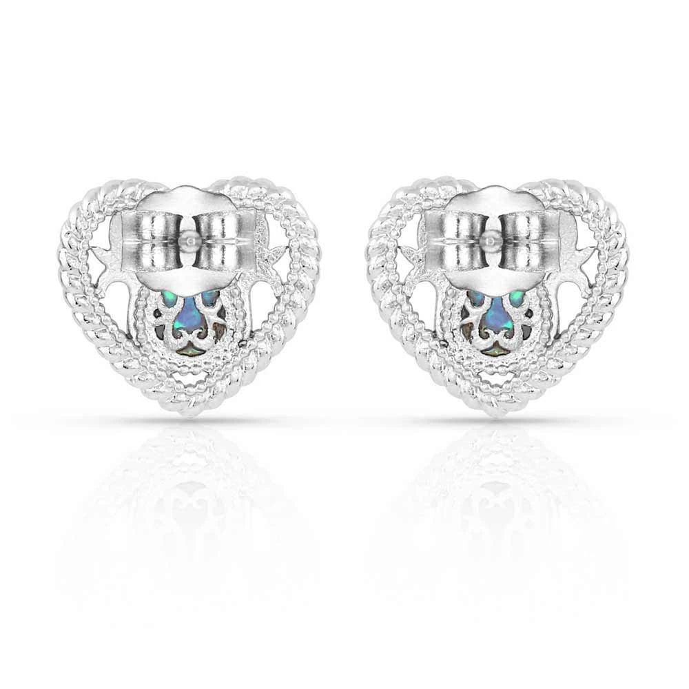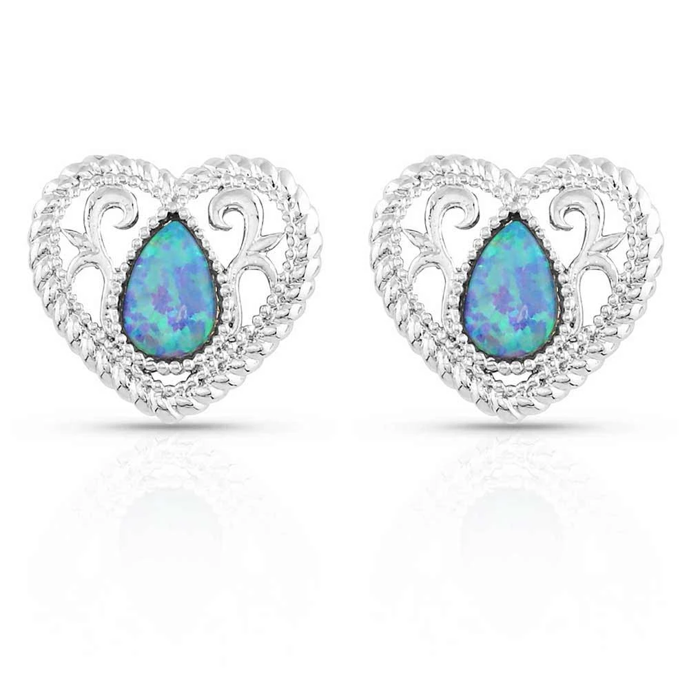 Small, quaint, and full of glee! Montana Silversmiths’ Gleeful Heart Silver Earrings are youthful with shine and color. They hang from a hypoallergenic post-back wire that holds their small heart shape. The heart shape is silver-toned and filigree wire detailed with roping texture. Within the center of the heart, a teardrop opal stone is placed upside down.