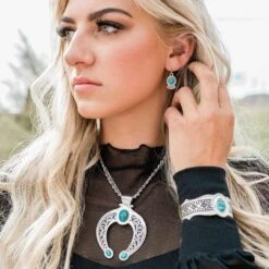 This silver-finished necklace from Montana Silversmiths hangs from a double 18″ chain. The chain holds a horse shoe shaped pendant that has an oval-shaped turquoise stone within. It has filigree on both sides and 2 more oval-shaped stones at the bottom.