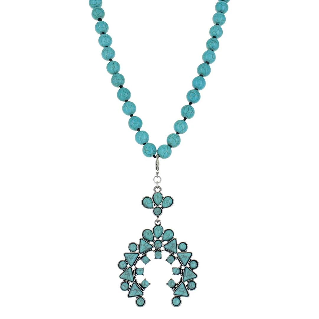 Calming, blue beads loop around into a hanging pendant that looks like a turquoise crown. This Montana Silversmiths’ necklace pairs perfectly with cowgirl boots and blue jeans. Drop pendant is detachable.