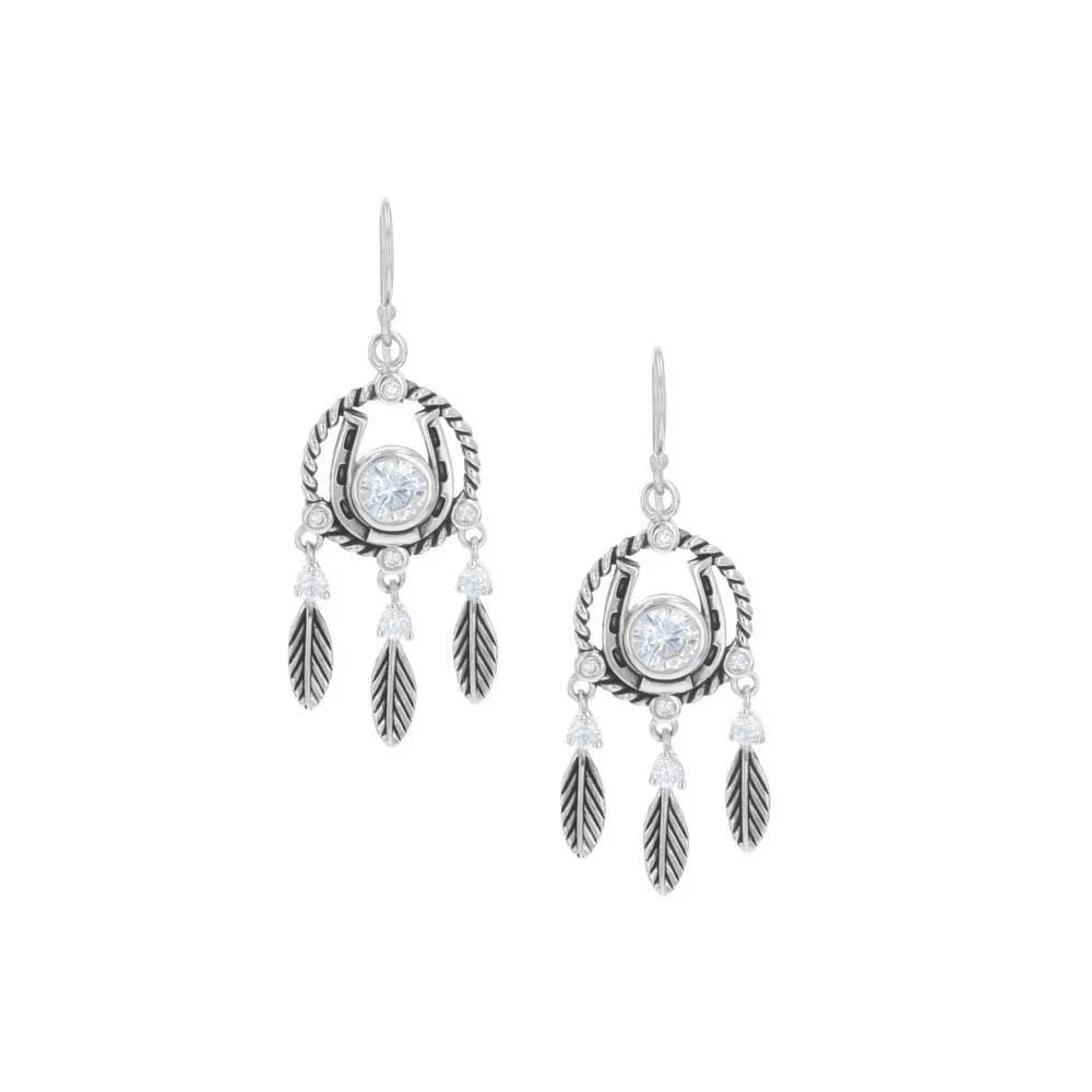 From Montana Silversmiths these horseshoe earrings are a dream! A center horseshoe holds a larger round stone in the base. The horseshoe sits inside of an antiqued silver tone rope circle with three small matching tone feathers dangling from the bottom of the circle. Each feather is accented by two small round clear stones that link it to the circle. Earrings have hypoallergenic stainless steel French wires.