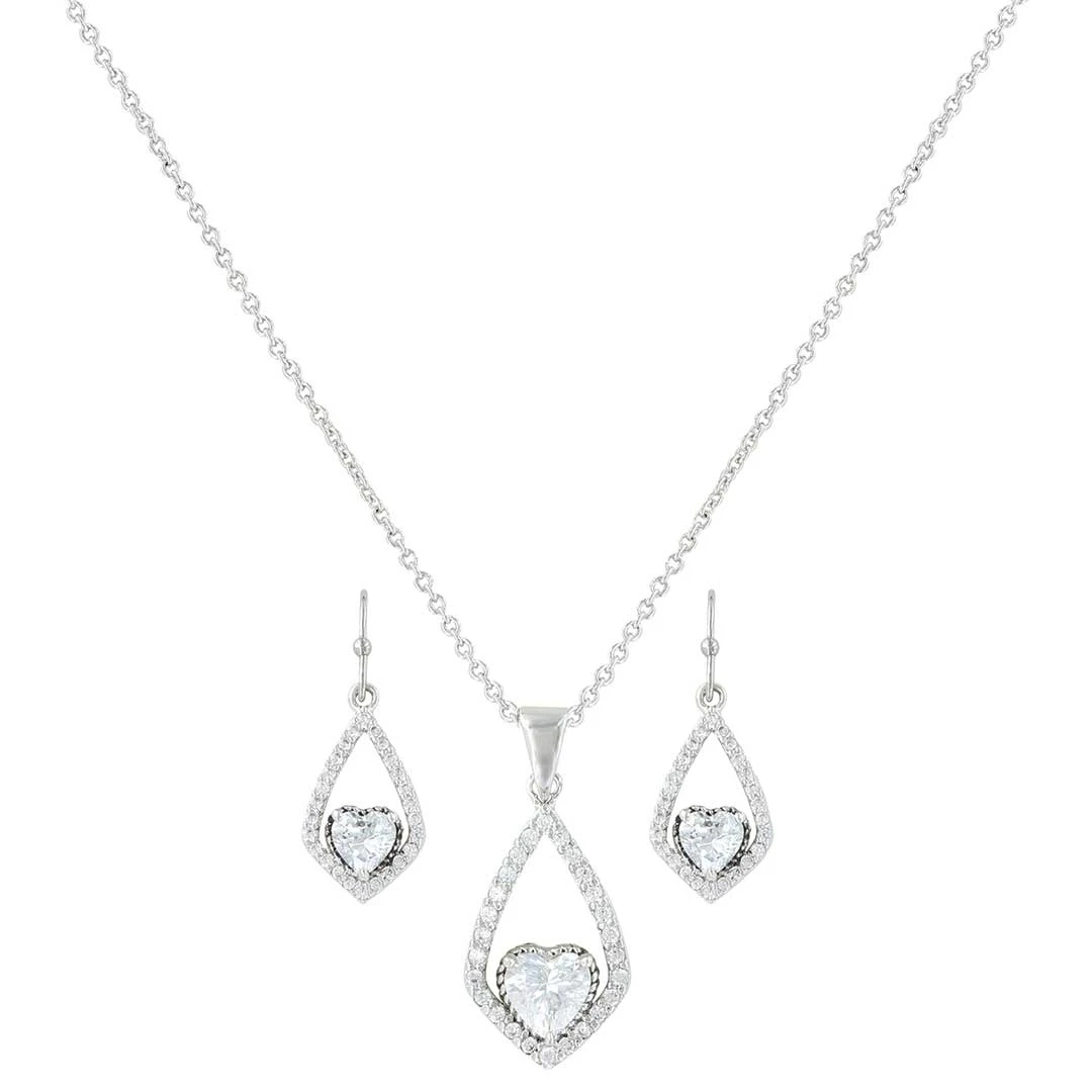 This brilliant jewelry set from Montana Silversmiths sparkles with its faceted clear rhinestones that catch every light. A large heart shaped rhinestones sits at the base of a rhinestone encrusted angled teardrop shape reminiscent of that fairy tale swing underneath the old oak tree capturing the light of sunny day. Earrings swing from hypoallergenic French hooks. Necklace pendant hangs on a princess 19 inch length chain.