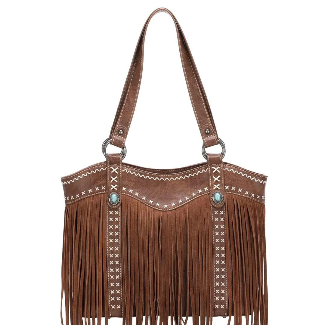 Made of PU leather, this tote bag has fringe on the front, cross stitch details, an antique silver turquoise stone concho and a top zipper closure. Inside the bag there is a single compartment divided by a medium zippered pocket, a zippered pocket and 2 open pockets with a zippered pocket and an open pocket on the back. The bag has metal feet on the bottom for protection and stability and a double flat strap.