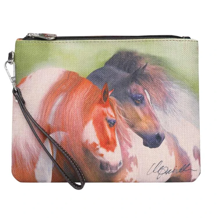 Made of the PU leather trimmed and canvas, this clutch features a horse painting by famous artist Laurie Prindle on the front, top zipper closure, inside single compartment and a detachable wristlet.