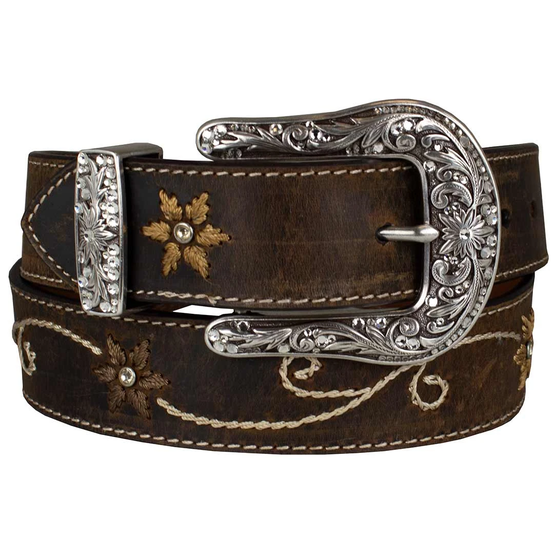 From Nocona Belt Co. this bay apache leather belt features floral embroidery with crystal and vine accents.