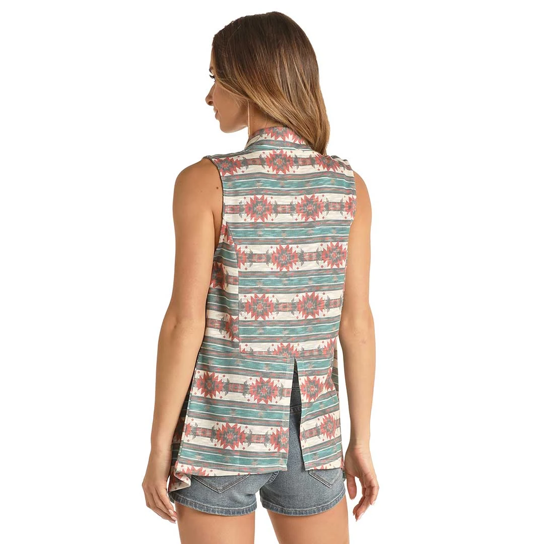 Another great layering piece from Rock & Roll Cowgirl. This women’s knit vest is done in an Aztec print, has a tapered open front and split lower back.
