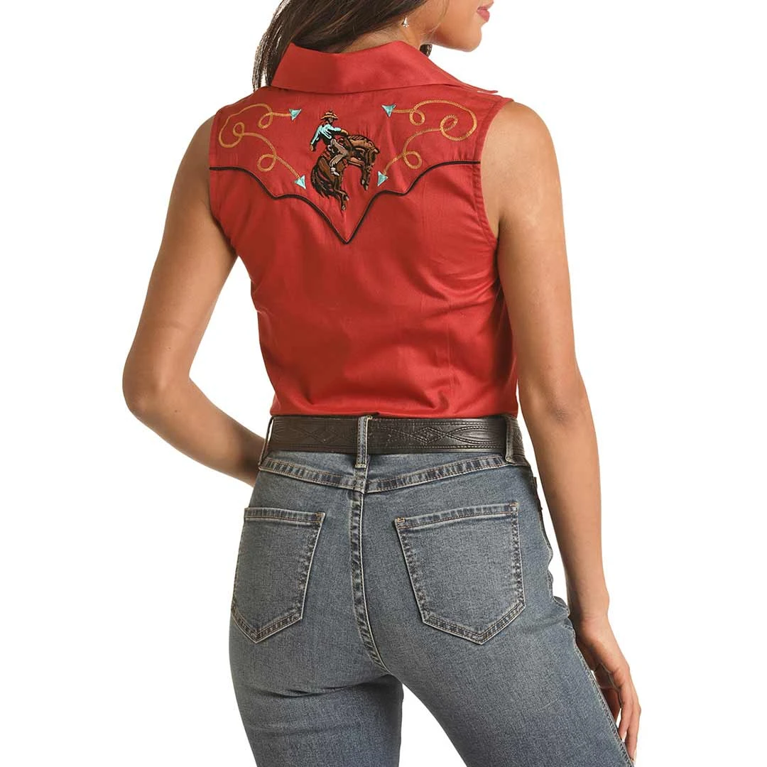 From Rock & Roll Cowgirl, this women’s sleeveless snap shirt features fun rodeo accents. It’s what every cowgirl needs this summer!