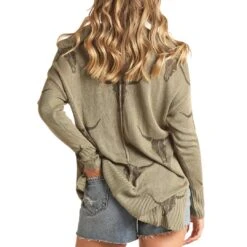 From Rock & Roll Cowgirl this long sleeve sweater features ribbed knit cuffs and hem and a steer skull design.