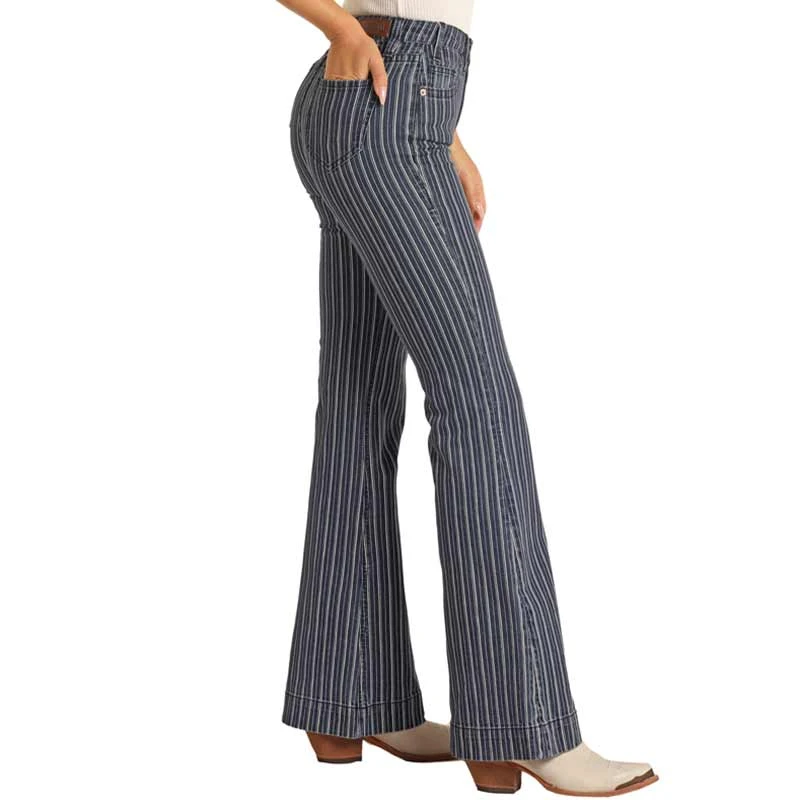 Add some flare to your denim collection with these high rise striped trousers from Rock & Roll Denim. These dark wash trousers have a comfort flare leg are fitted at the thigh and feature light wash vertical stripes and standard trouser styling.