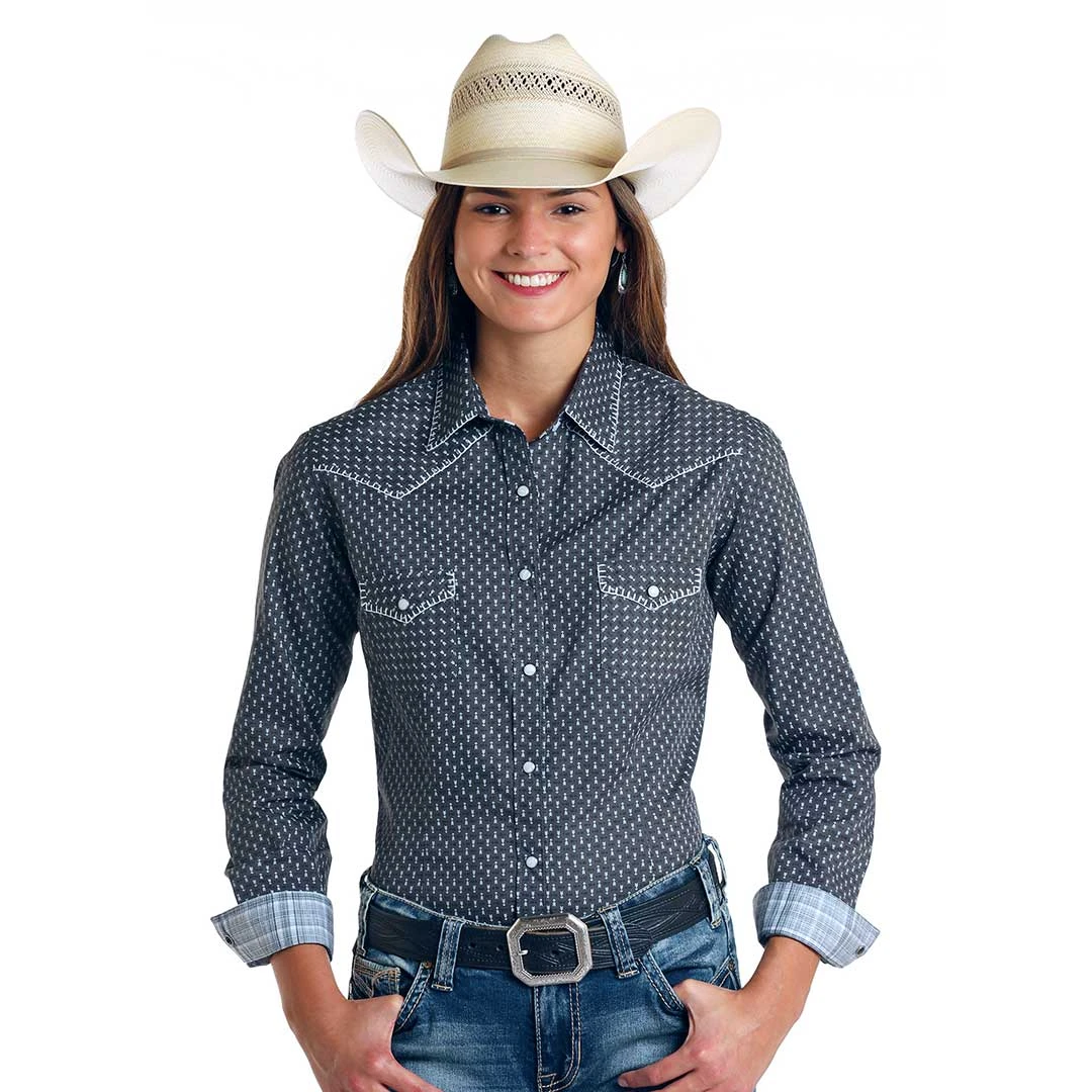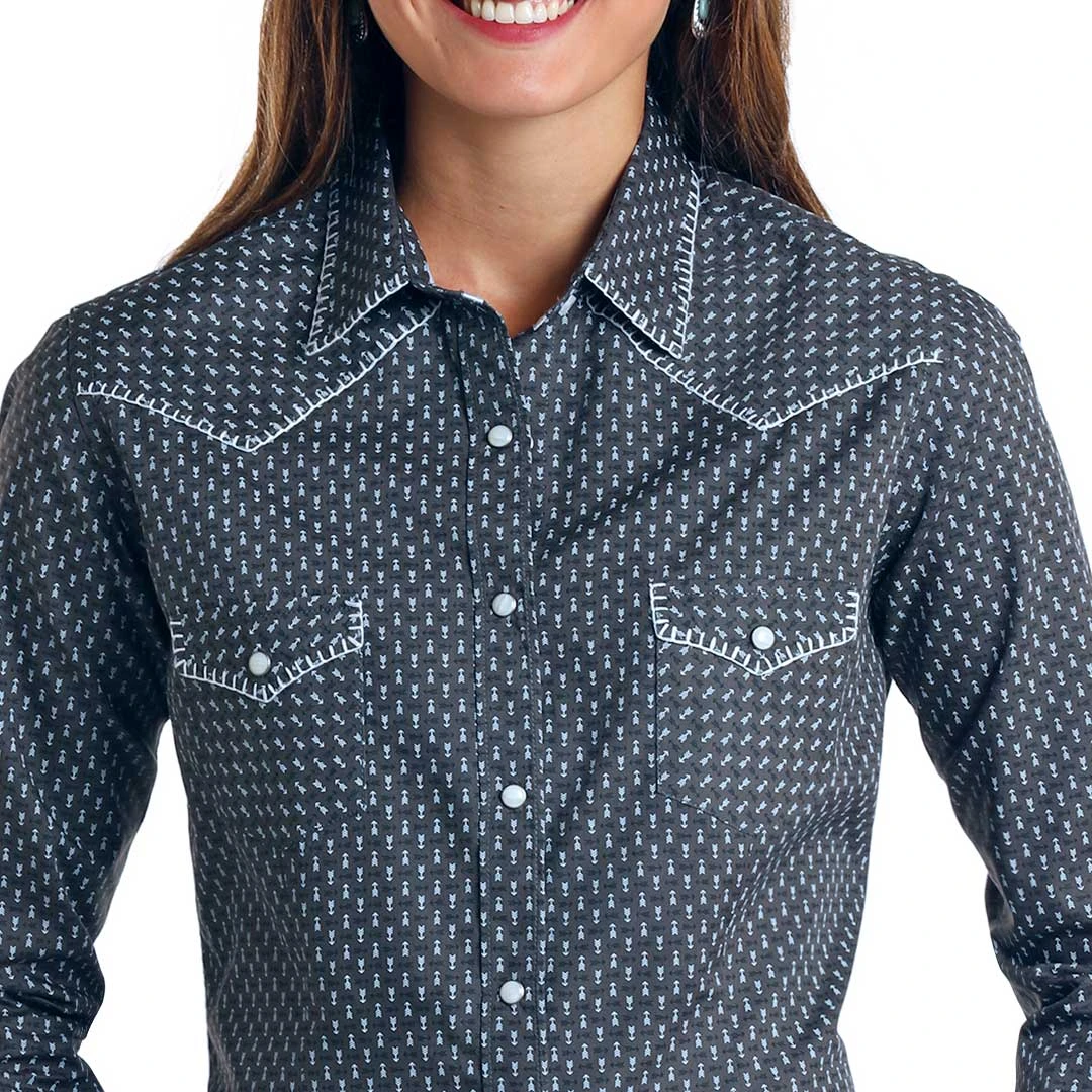 From Panhandle’s Rough Stock line, this women’s snap shirt is done in allover mini arrow print. It features heavy blanket stitching for a vintage look.