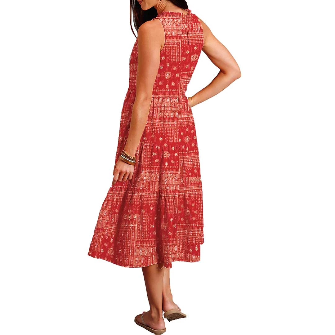 Crafted from soft, smooth 100% rayon, this women’s Western-style sleeveless dress features our eye-catching all-over Bandana Patchwork print. It has a fitted bodice with bust darts and ruffled stand collar, along with a three-tier ruffle skirt that is accented by side seam pockets. Finished with a self-button back closure and invisible zipper, it has an easy and elegant silhouette that works both for both daytime and evening occasions.
