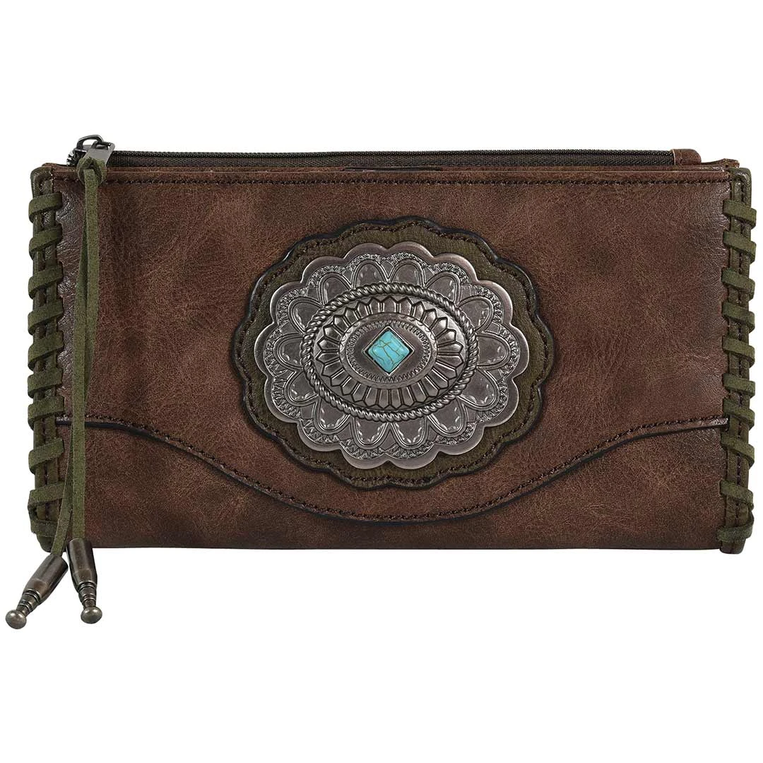 From Tony Lama, this women’s wallet is brown and features a large metal concho with a faux turquoise accent and whipstitch detailing. It has 8 slip pockets, five card slots, one zip pocket, one ID slot, bolo zipper pull and snap closure.
