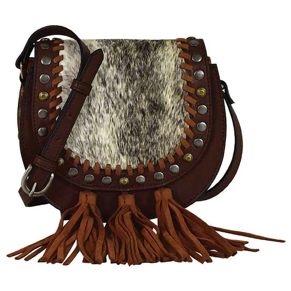 From Tony Lama, this women’s crossbody bag features natural cow hair on the front with stud, whipstitch and tassel accents. It has one compartment with three card slots and a front flag magnetic snap closure.
