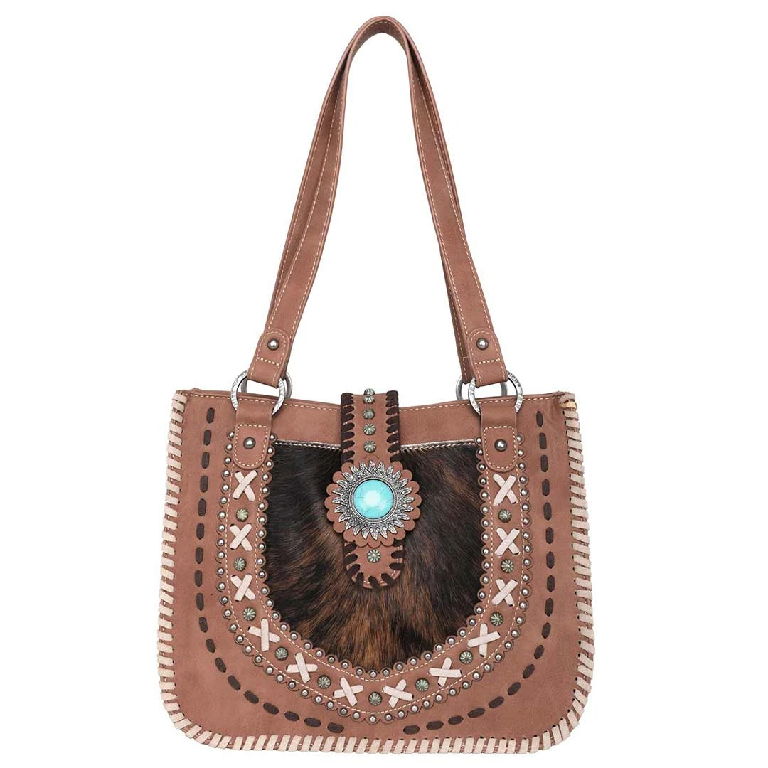 From the Trinity Ranch line by Montana West, this partial genuine leather hair-on hide and PU leather tote bag has genuine hair-on cowhide on the front pocket, antique silver turquoise concho on the flap with magnetic button closure, accented with antique silver and patina gold studs, whipstitch detail and a top zipper closure. Inside the single compartment is divided by a medium zippered pocket and includes a zippered pocket and 2 open pockets. There is a zippered pocket on the back as well as an open pocket and metal feet on the bottom for protection and stability.