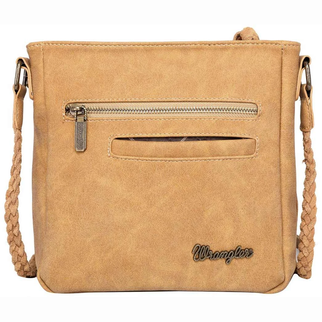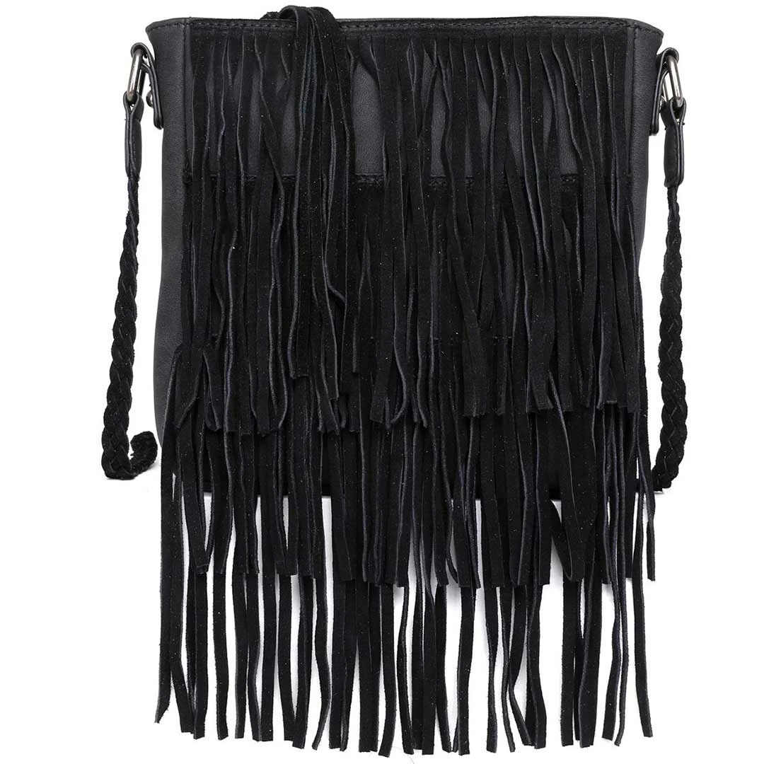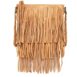 Made of PU leather, this Wrangler crossbody By Montana West has tiered leather fringe, top zipper closure, inside zippered compartments has 2 open pocket and a zippered pocket, a zippered pocket on the back with wrangler rope logo, metal feet on the bottom for protection and stability and a braided crossbody strap.