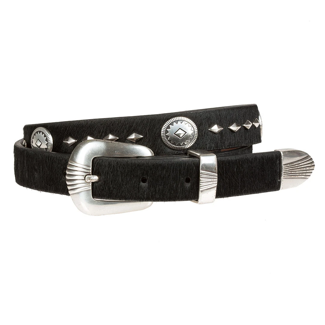 From Spirit Leather Works Wrangler collection, this hair on hide with full grain leather belt features conchos and diamond studs including a 3 piece silver buckle.