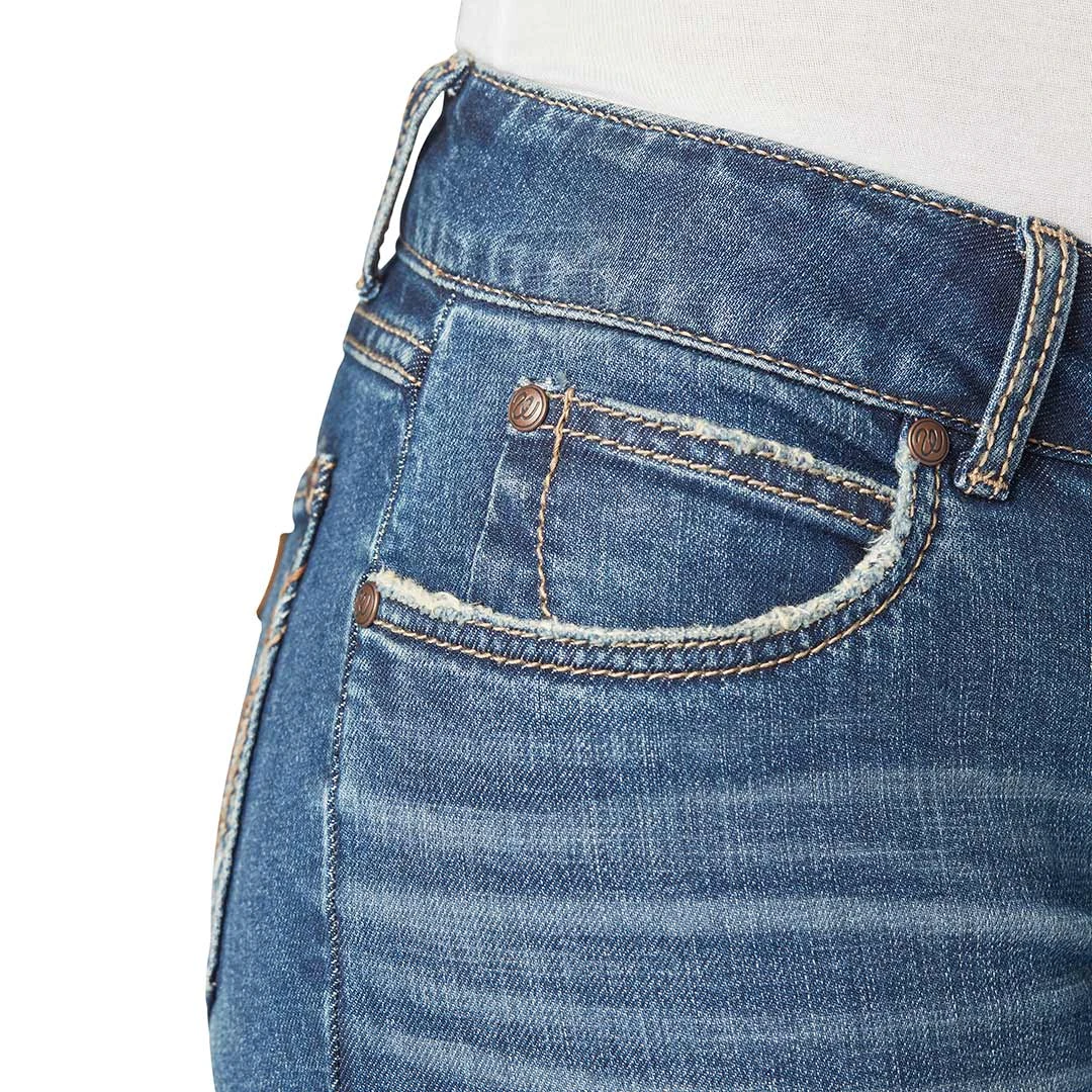 When it comes to women’s Western jeans, Mae has consistently stayed ahead of the trends. Now, she’s back with a stylish flared leg opening you’re going to love. The Wrangler Retro Mae flare jeans feature the same details you love about the original: a contoured waist that prevents gapping, a comfortable mid rise, and the classic 5-pocket styling. This new silhouette is redesigned to flare out at the knee to a dramatic leg opening that pairs perfectly with cowgirl boots and winter booties alike.