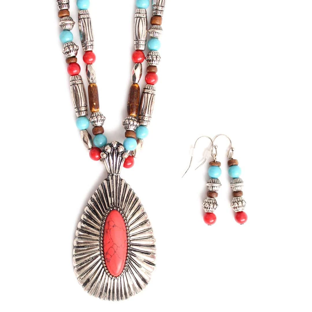 Flaunt your western glam with this concho pendant necklace with matching earrings from Wyo-Horse. The necklace features a large concho pendant with coral stone centre, dual multi-coloured beaded cords and it comes with matching beaded earrings on French hooks to make accessorizing easy.