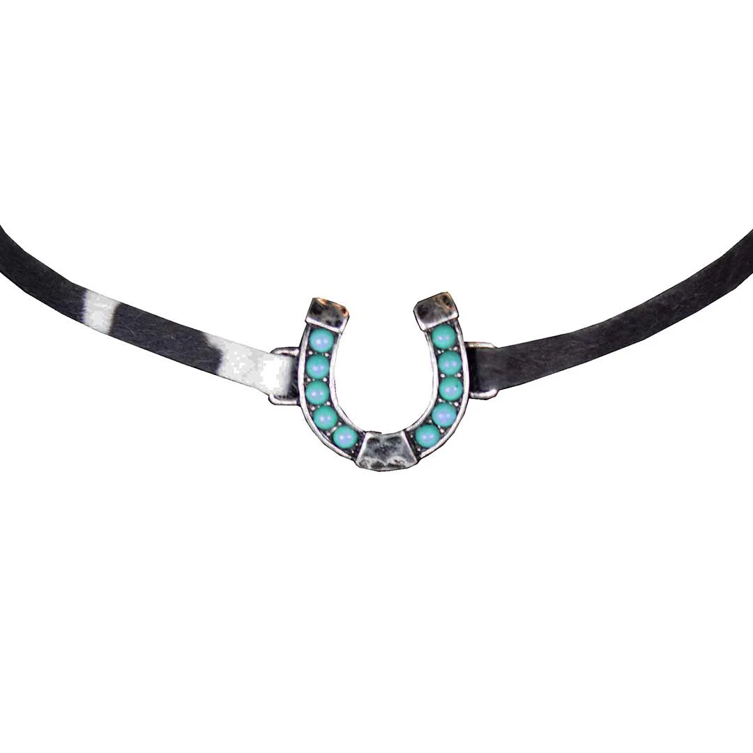 Bold yet delicate, this choker from Wyo-Horse will look great with everything, especially your favourite denim and boots. The choker features a stone horseshoe pendant set into copper or silver with a hair-on-hide strap and an adjustable chain with lobster claw closure.