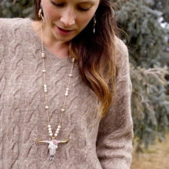 Show your western style with this oversized steer skull statement pendant and delicate bead earrings from Wyo-Horse. The pendant hangs from a beaded chain with 3″ extender and lobster claw clasp and the single bead earrings on hooks with stoppers .